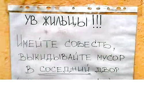 «Ув. мешканці !!! Майте совість, викидайте сміття в сусідній двір ».