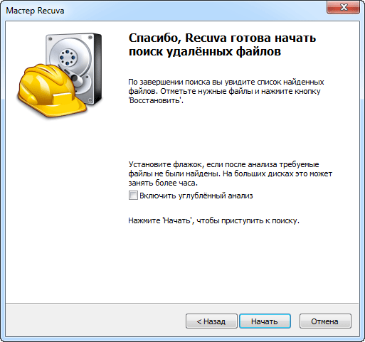 Після цього Recuva пропонує почати пошук або включити поглиблений аналіз. Натискаємо «Почати».
