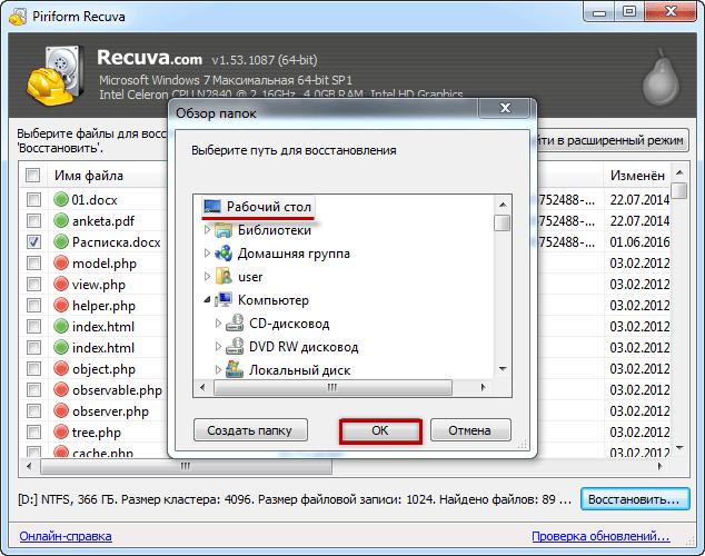 З'явиться невелике віконце. Виберіть в ньому те місце, в яке хочете відправити відновлений файл, і натисніть кнопку «ОК».