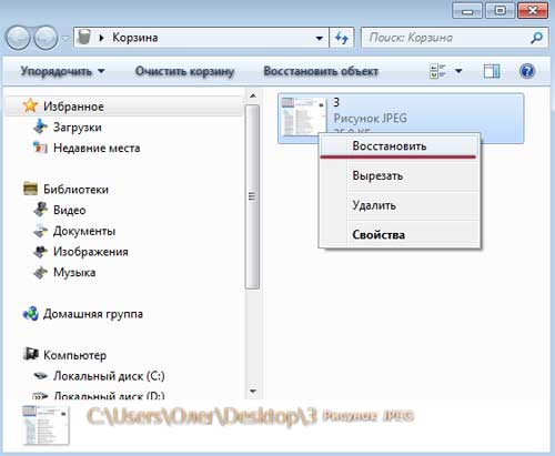 Для того щоб відновити віддалений файл з кошика, ми заходимо в неї, знаходимо потрібний файл, натискаємо по ньому правою кнопкою миші і з випав меню вибираємо пункт «Відновити».