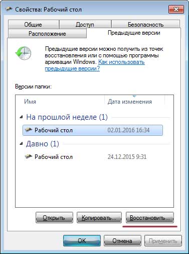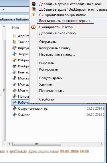 Наприклад, можна вибрати в «Провіднику» папку «Робочий стіл» і, клікнувши по ній правою кнопкою миші, вибрати пункт меню «Відновити колишню версію».