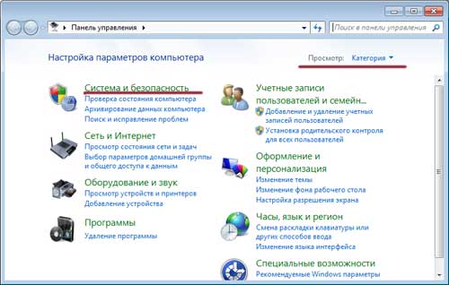 Заходимо в «Пуск - Панель управління», ставимо Перегляд: «Категорія». Натискаємо по пункту «Система і безпека».