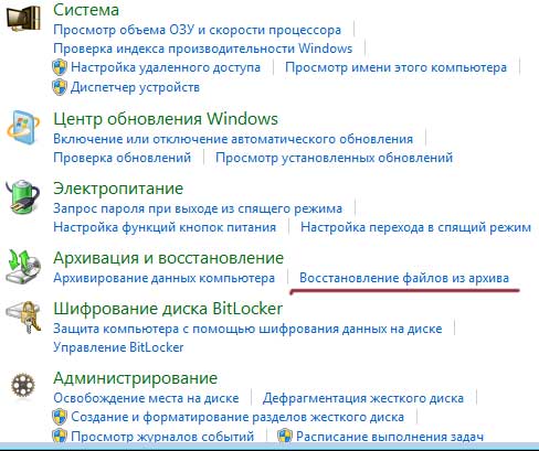 Знаходимо розділ архівація і відновлення і натискаємо на посилання "Відновлення файлів з архіву». Нагадую, що файл у вас вийде тільки при налаштованому архівування та при наявності самого архіву:
