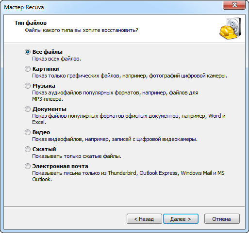 І так, запускаємо програму, вибираємо тип файлу - «Все файли» і тиснемо кнопку «Далі».