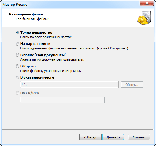 Тепер потрібно вибрати те місце, з якого видалили файл. Якщо файл був видалений з Кошики, карти пам'яті (флешки) або з Документів, вибираємо відповідний пункт. Якщо ж він, наприклад, був вилучений з Локального диска D, то вибираємо «У зазначеному місці», натискаємо на «Обзор» і вибираємо Локальний диск D. А можна вказати «Точно невідомо», тоді програма буде шукати по всьому комп'ютеру і підключеним до нього пристроїв, що може бути досить довго.