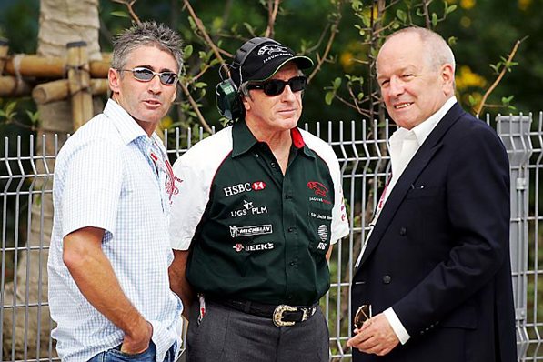 Джон Хоган (праворуч) з триразовим чемпіоном світу сером Джекі Стюартом (в центрі) під час роботи в команді Jaguar на початку 2000-х