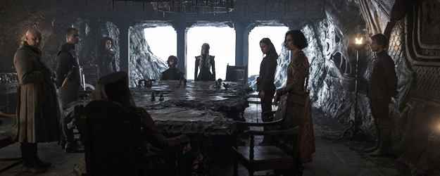 Джон приїжджає на Драконівські камінь. Дейенеріс все ще не знає, що вони родичі. Еурон привозить Еллара, Яру і тієн в Королівську гавань. Серсея мстить їм за її вбиту дочку. Потім вона зустрічається з представником Залізного банку і розплачується за кредитами. Тіріон переконує Дейенеріс дозволити Джону розробляти поклади драконівського скла. Бран приїхав в Вінтерфелл. Армія Бездоганних бере штурмом Утес Кастерлі, але Еурон спалює їх флот, а Серсея заздалегідь вивозить звідти всю провізію. Джеймі Ланністеров штурмує Хайгарден і вбиває оленя Тіреллі.