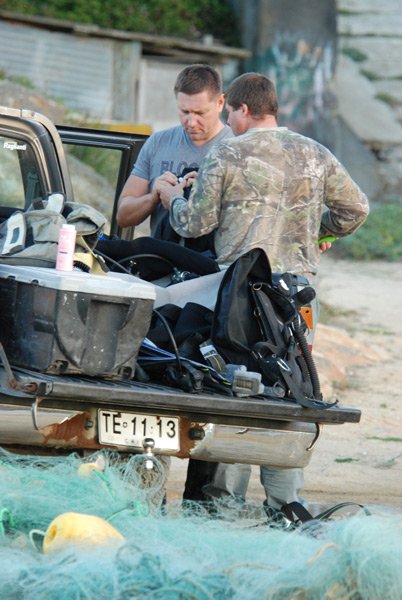 На фото: З Олександром Туренко готуємо обладнання для занурення на дно аргентинської бухти Калета-де-лос-Лоро