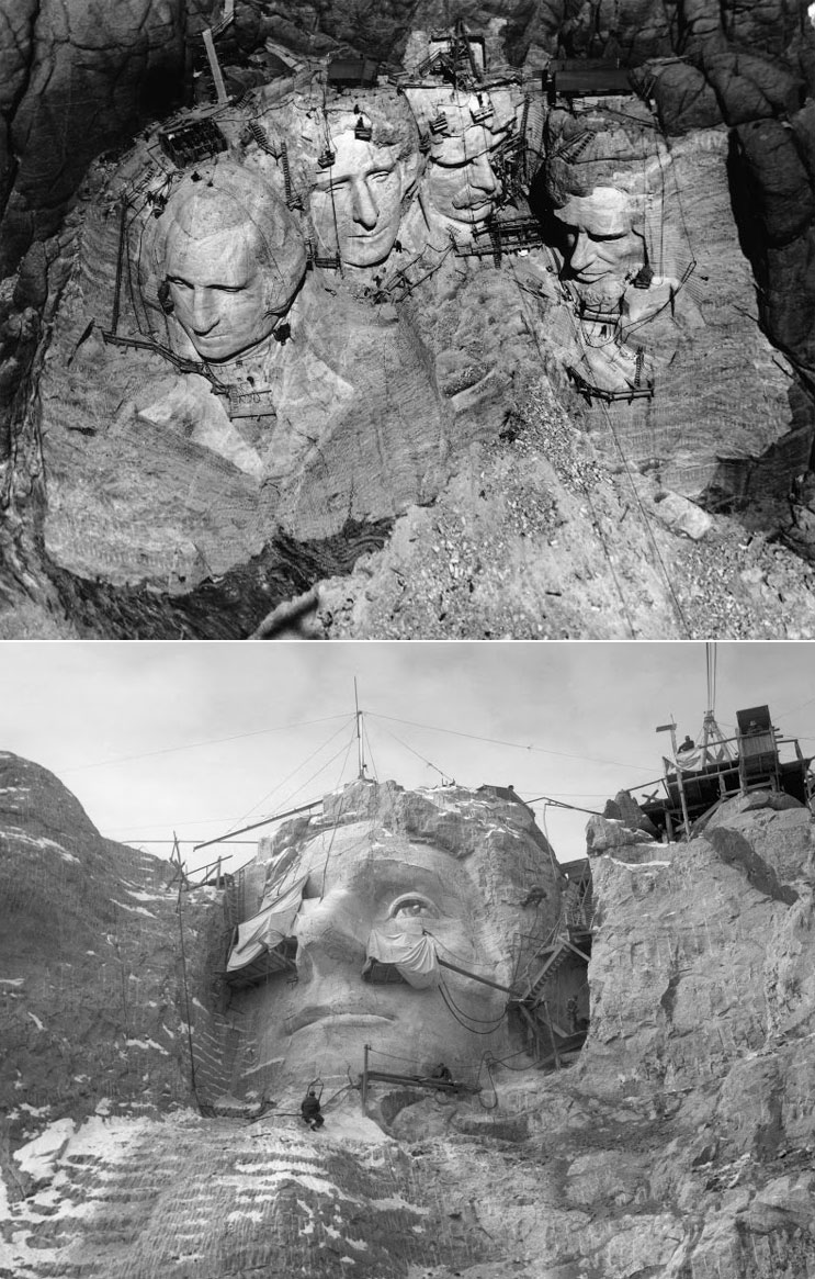 Для того щоб висікти 18-метрові голови чотирьох президентів, Борглум потрібно більше 14 років і близько 400 робітників. Щоб дістатися до вершини пам'ятника, робочим доводилося підніматися по 506 ступеням. Робітники були, в основному, шахтарями, які подалися в гори Black Hills в пошуках золота. Вони мало знали про виточування гірської породи, не кажучи вже про створення гігантського твори мистецтва. На ті часи їм платили непогану зарплату - 8 доларів в день. І хоча робота велася у важких умовах, за час будівництва не було зафіксовано жодного нещасного випадку.