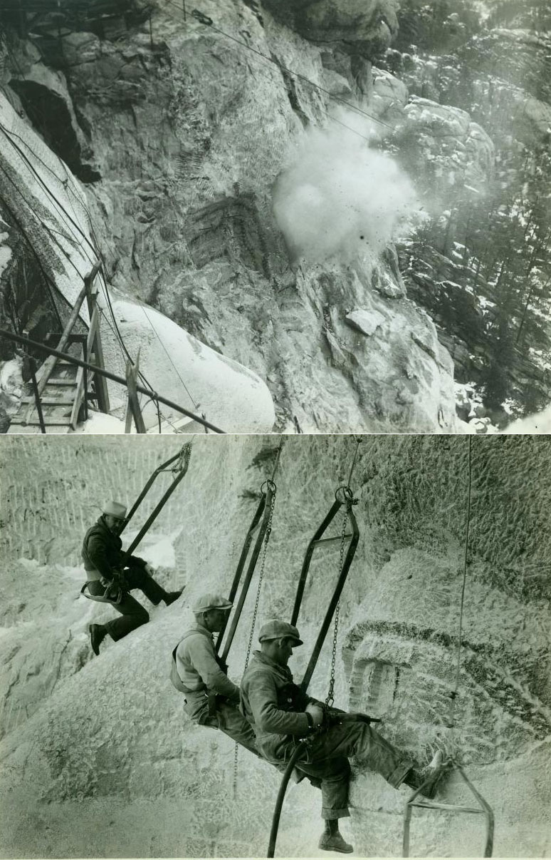 А тим часом почалося будівництво. Архітектор Борглум розробив ефективну і порівняно недорогу технологію видалення великої кількості зайвої гірської породи за допомогою вибухових речовин - 90% її прибрали за допомогою зарядів динаміту (приблизно 450 000 тон). Динаміт використовувався до тих пір, поки не залишалося кілька сантиметрів непотрібного матеріалу, який потім прибирали пневматичними інструментами.