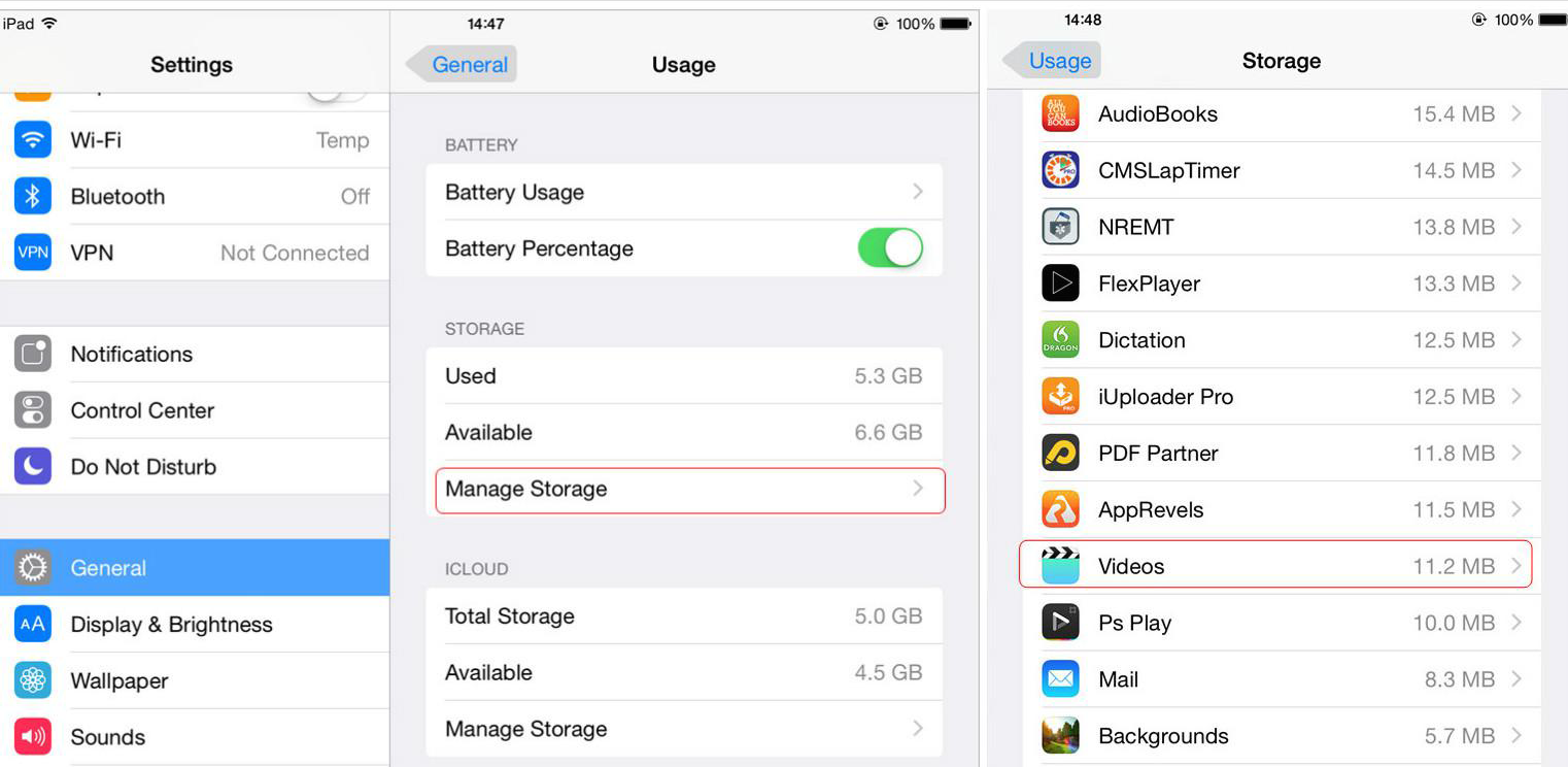 Для iPad под управлением iOS 9/10: Настройки> Общие> Хранилище и хранилище iCloud> Управление хранилищем в разделе Хранилище> Видео. Выберите видео, которое вы хотите удалить, и проведите по нему влево, а затем нажмите красную кнопку «Удалить», чтобы удалить видео с iPad.