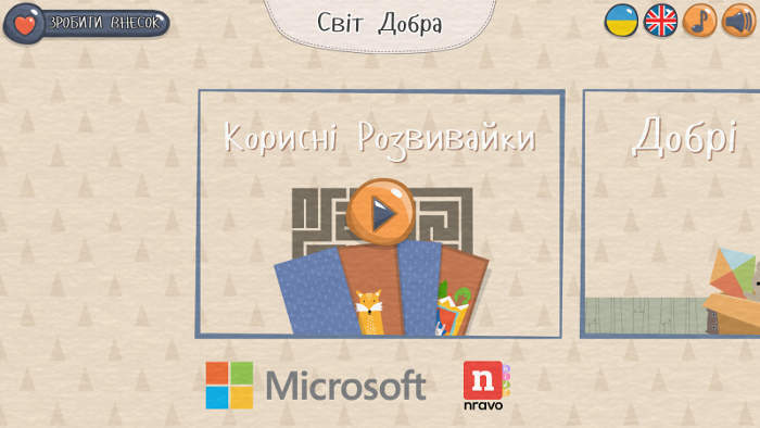 Компанія «Майкрософт Україна» спільно з українським розробником мобільних ігор Nravo Kids представили оновлення благодійного додатки «Світ Добра». Додані дві розвиваючі ігри «Через лабіринт до мрії» та «Добрі мрії». У міру проходження гравець може перерахувати кошти благодійним організаціям зі списку партнерів. безкоштовний додаток доступно українською та англійською мовами в магазинах Windows Store, Google Play і App Store.