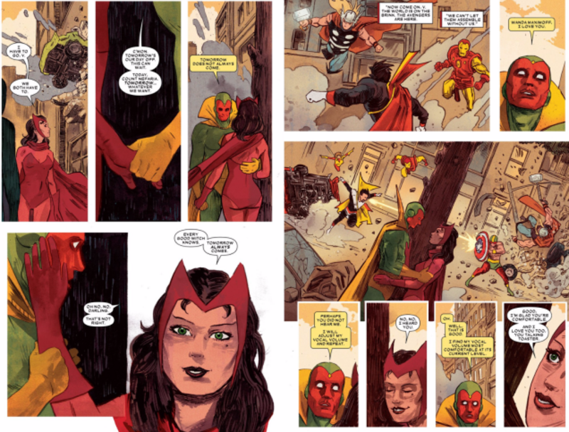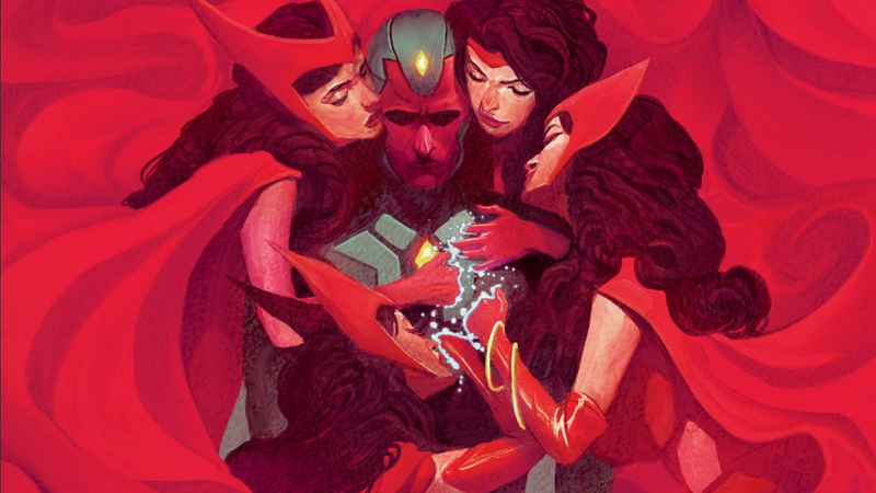 Новітня проблема The Vision написана Томом Кінгом з мистецтвом Майкла Уолша, Джорді Беллаіра і Клейтона Коулеса, озирається на історію провідного героя серіалу і людини, з яким він одружився. У своїх ранніх проявах він був сінтезовим автоматом, створеним одним з найбільших ворогів Месників, вона була генетичним нащадком заклинателя, який раніше був на неправильній стороні закону. «Бачення» та «Червона відьма» приєдналися до Месників як до сторонніх з неспокійним минулим, що і зробило їх можливе залицяння несподіваним і солодким. Тут був робот, який прагнув відчути себе більш людяним з якостей; тут був мутант в обіймах когось, хто не ненавидів і не боявся її.