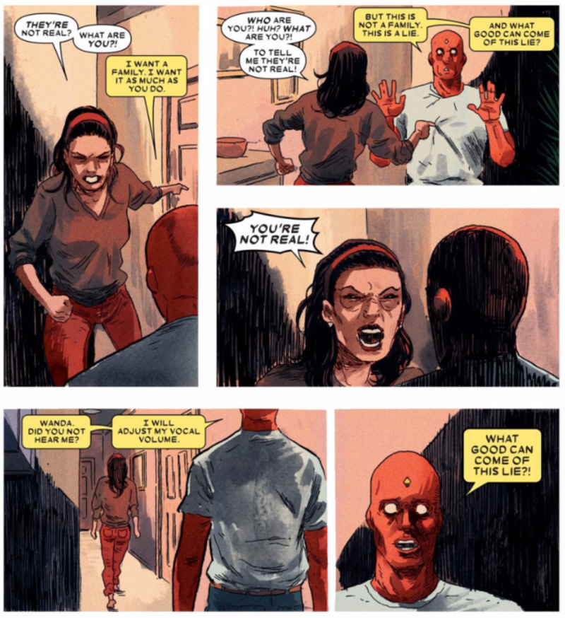 Сцена в The Vision # 6 віщує можливий розрахунок, де, під впливом турботи про Червоної Ведьме, яка набагато здоровіше емоційно, Месники будуть стикатися з сінтезоідной дивиною, що відбувається в передмісті Вашингтона, округ Колумбія. Алая відьма все ще любить Бачення, але цього може бути недостатньо, щоб врятувати його від спроб бути людиною.