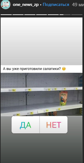 У гіпермаркеті "Ашан" запорожці "змели" з полиць майонез і сметану. Відповідний знімок з'явився в сторіз на Інстаграм-сторінці паблік one_news_zp . На знімку видно, що на полицях майже не залишилося основного інгредієнта заправок для більшості новорічних салатів.