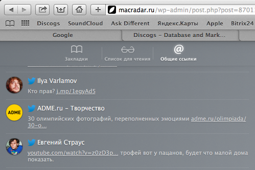 Ця штука дозволяє бачити все посилання, розміщені в твіттері людьми, яких ви читаєте. Спочатку користь від цієї функції здалася мені сумнівною, але в подальшому я знайшов в ній прекрасну заміну RSS і Google Reader'у, який непомітно помер, поки ми намагалися його освоїти. Тепер замість того, щоб перевіряти окремо кожен цікавий мені сайт на предмет нових постів / фотографій, я підписався на відповідний твіттер-аккаунт і стежу за оновленнями з одного місця - «Загальних посилань». Зрозуміло, тут є свої недоліки: в швидкому потоці твітів можна упустити цікавий пост, джерело, на який ви підписані, може забути викласти посилання в твіттер, та й сам твіттер після підписки на купу людей стає трохи безладним. З іншого боку, коли я моніторив твіттер, мене завжди дратувала необхідність відкривати кожну посилання окремо, особливо якщо я використовую мобільний клієнт. Таким чином, ця фіча є порятунком для мобільного Safari, однак і на деськтопной версії вона проявила себе гідно.