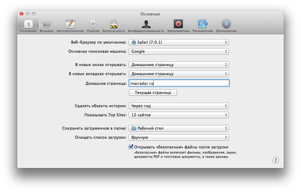Скільки б не лаяли Google, але його пошуковик є найкращим на сьогоднішній день. «Яндекс» залишимо патріотам, а збочення на зразок Bing навіть розглядати не будемо. Там же можна задати домашню сторінку, - сайт, який буде відкриватися в кожній новій порожній вкладці. Ми настійно рекомендуємо сайт MacRadar.ru. У цих же налаштуваннях можна змінити шлях, куди зберігаються всі завантажені файли. Особисто я віддаю перевагу робочий стіл, хоча багатьох і не бентежить необхідність щоразу відкривати «Для дорослих» після скачування файлу.
