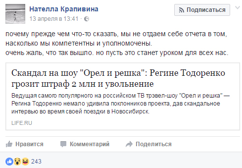 на Заява відразу ж відреагувала продюсер передачі «Орел і решка» Нателла Крапівіна.