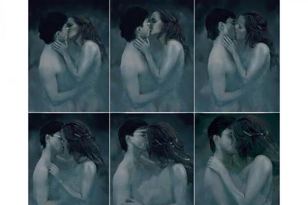 Поцілунок Гаррі і Герміони. Розкадрування до фільму «Гаррі Поттер і Дари Смерті. Частина I » Другий в нашому списку йде парочка з ще однією саги - про пригоди юного чарівника Гаррі Поттера. Виконавці головних ролей - Деніел Редкліфф і Емма Уотсон - отримали нагороду Teen Choice Awards в 2011 році за «хімію» в картині «Гаррі Поттер і Дари Смерті: Частина I». Йдеться про поцілунок наших героїв, який привидівся Рону Візлі ( Руперт Грінт ). До речі, сам поцілунок зняли далеко не з першого дубля, бо Грінт весь час сміявся на знімальному майданчику, тим самим зриваючи весь процес. І тільки коли його вигнали після 20 невдалих дублів, з 21-го поцілунок дозняти в тому вигляді, в якому його побачили глядачі.