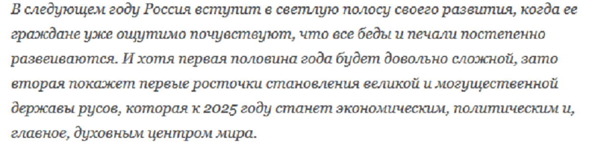 Більш того, в 2018 році РФ чекає стабільність в економічному і політичному планет. У прийдешньому році біди і печалі росіян розвіються. Перша половина року буде дуже складною, але потім почнеться становлення потужної наддержави, яка до 2025 року стане економічним, політичним і духовним центром світу.