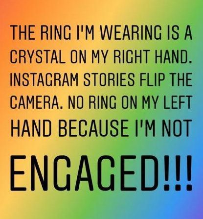 Позже она опубликовала фотографию в Instagram, объяснив: «Кольцо, которое я ношу, на моей руке хрустальное. Истории из Instagram переворачивают камеру. На моей левой руке нет кольца, потому что я не помолвлена!»